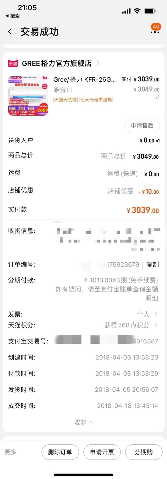 2018年4月,来自武汉的王女士在天猫“GREE格力官方旗舰店”购买了一款KFR-26GW/NhBaB3大一匹壁挂式变频空调,安装后一直正常使用。但到了去年,该空调开始吹出酸臭味,味道就像“穿了很久的袜子”,而且这个味道全家人都能闻到。