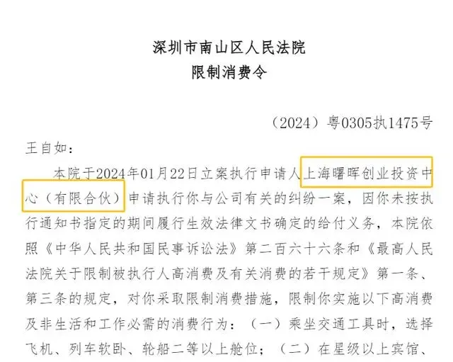 近日,王自如因未按执行通知书指定的期间履行生效法律文书确定的给付义务,被深圳市南山区人民法院采取限制消费措施。根据案件流程信息,今年1月,王自如已因此案被强制执行3383余万元。